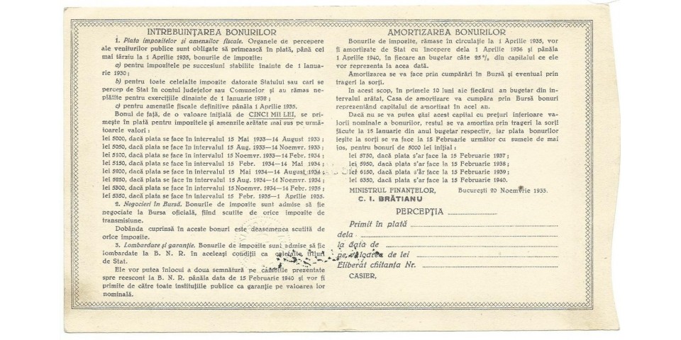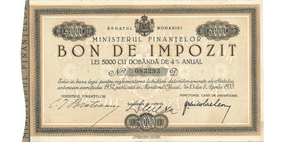 Bon de impozit emis de Ministerul Finantelor din Regatul Romaniei cu dobanda de 4% anual